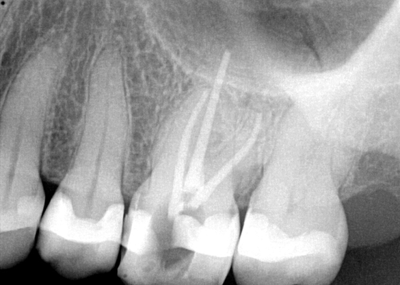 A#15 K-file was used to develop a smooth glide path. Working length was verified with an electronic apex locator to 21 mm for the mesiobuccal and distobuccal canals and 23 mm for the palatal canal.