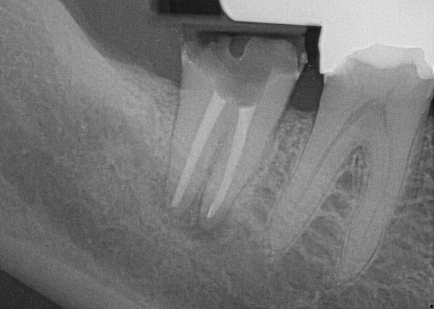 A smooth glide path was developed with a #15 K-file. Working length was verified with an apex locator to 29 mm.