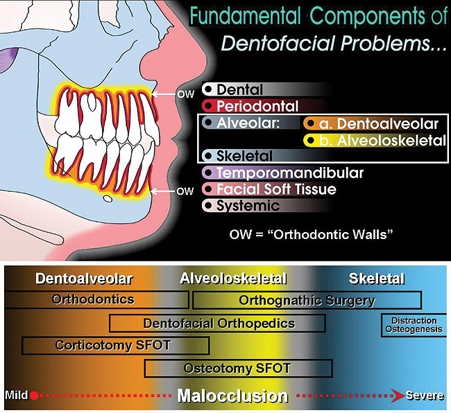 Addressing all the fundamental components is important when optimally treating a malocclusion (especially the dental component, eg, worn, broken, or misshapen teeth). However, this article focuses on those involving alveolar bone, specifically the dentoalveolar and alveoloskeletal components. Malocclusion problems involving skeletal component discrepancies are best managed with traditional orthognathic surgery, or in extreme deformities, with distraction osteogenesis. These procedures that specifically address the overall skeletal issues might be more appropriately classified as orthodontically facilitated surgical therapies (OFST).