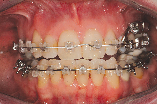 When the underlying problem is an alveoloskeletal discrepancy (such as severe dentoalveolar retrusion or protrusion), the osteotomy surgery should be performed after orthodontic leveling and aligning has been completed (Figure 33). This allows the orthodontist to use rigid arch wires during and after surgery to better control the osteotomized dentoalveolar segments. This control is needed especially when combining osteotomies with absolute anchorage (dental implants, mini-implants, and plates) (Figure 18) and with orthopedic forces utilizing a jackscrew-type appliance38 (Figure 25 through Figure 28) to further modify the alveoloskeletal relationships. Selective corticotomies occasionally are performed in the middle stages of orthodontic therapy to facilitate individual tooth movement or to aid in dentoalveolar intrusion with anchorage plates after control has been established using rigid arch wires.