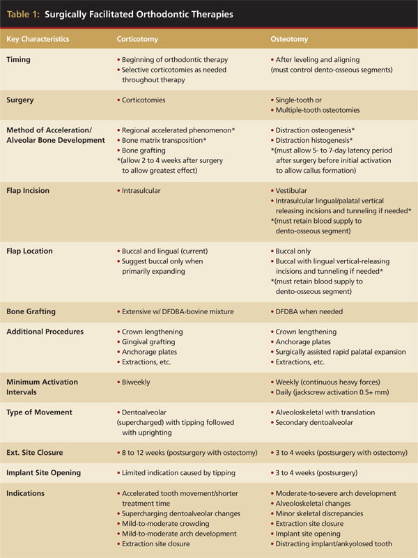 These are just some of the reasons for alternative techniques for the development of surgically facilitated orthodontic therapy (SFOT). SFOT techniques, using corticotomies and single- or multiple-tooth osteotomies to enhance orthodontic movements, are gaining more popularity. When providers first hear about these techniques and the shortened treatment times, their initial reaction tends to be that of skepticism. Most doubt whether they could justify referring their patients for surgery simply to hasten orthodontic tooth movement. However, on closer evaluation, these techniques provide some very promising concepts to enable better overall treatment for patients with complex problems. Although these procedures are scientifically based, more clinical evidence and better protocols are needed before they gain wide acceptance as viable treatment options.