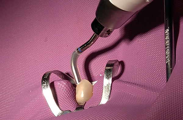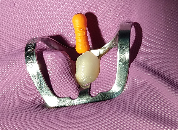 Indiscriminate removal of tooth structure by hunting for the canal orifices when anatomy is either not understood or ignored weakens the tooth, specifically in the cervical area, where exploration occurs when trying to find the orifices. Understanding tooth anatomy and the location of the canal orifices in relation to that anatomy aids in preserving tooth structure, especially in the cervical region (Figure 2). The process can become a challenge when endodontically treating a tooth with a previously placed crown because the practitioner may lose orientation of the anatomy due to the restoration having corrected tooth rotation, tipping, or other positional changes. Ideally, the objective is to remove minimal tooth structure with only what is necessary to identify the canal orifices and provide straight-line access into each canal in the tooth. After isolation with a rubber dam, all decay is removed from the tooth to be treated, as well as old restorative materials present that may limit canal access. A pre-endodontic buildup may be performed to reinforce the remaining tooth structure and allow clamp placement with access into the canals (Figure 3).3