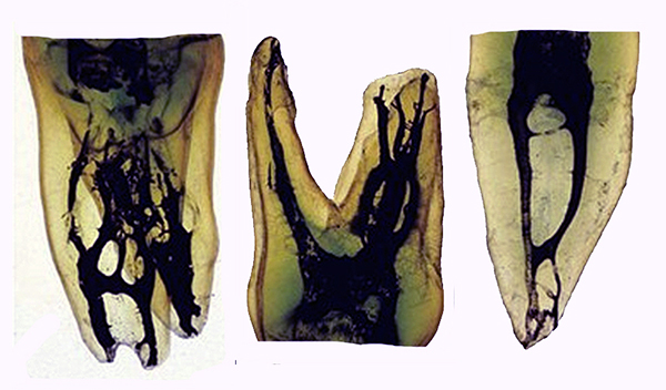 The main objective of endodontic therapy is the removal of necrotic tissue (pulp) and bacteria within the canal system. Irrigation is crucial for successful endodontic treatment and is a counterpart to proper instrumentation. Endodontic files, be they hand files or rotary, are unable to access the entire canal system and are confined to the main canals present. Lateral canals, anastomosis, fins, and other canal anatomy off the main canals cannot be instrumented with files; to remove pulpal tissue from these areas, irrigation is required (Figure 8). Irrigants reduce friction between the instrument and dentin, improving cutting efficiency of the files while dissolving tissue, and have an antimicrobial/antibiofilm effect. Irrigation is also the only way to reach areas of the root canal wall that are not touched by mechanical instrumentation.