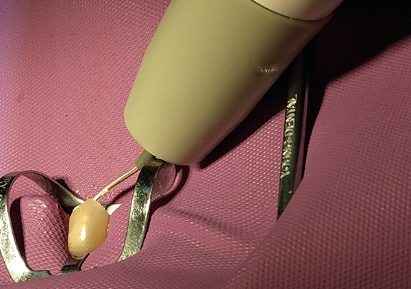 Sealer is placed into the canal with a sized paper point to ensure that excessive sealer is not forced out periapically. The tip of a gutta-percha gun (eg, Duo-Gun, DiaDent; GPO, Cicada Dental, cicadadental.com; Elements™, Sybron Endo) (Figure 12) is inserted into the canal, and heated gutta-percha is extruded as the tip is withdrawn, leaving a small portion of warm gutta-percha in the canal at the apical. A condenser (eg, Dia-Kondensor, DiaDent; Buchanan Hand Plugger, Sybron Endo; Finger Plugger, Brasseler, brasselerusa.com) that is sized to the final file size is immediately inserted into the canal to WL to compact the warm obturation material. A radiograph is taken to verify apical seal, and the gutta-percha gun is used to backfill the canal to the orifice, with additional compaction with a hand instrument. As an alternative technique, a single cone can be placed with sealer to WL and the cone cut off and condensed in the canal with a heated pen-like instrument (eg, Duo-Pen, DiaDent; Elements, Sybron Endo; Thermique™, Parkell, parkell.com) (Figure 13). The remaining canal system is backfilled with warm gutta-percha and further condensed, completely filling the canal anatomy (Figure 14). The pen instrument also aids in post preparation by assisting in removal of the obturation material before use of a post drill. This decreases the potential to divert from the canal trajectory as the post drill then follows the hole in the obturation material just created.
