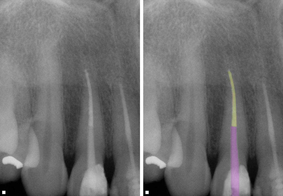 Premixed CaOH2 pastes overcome the negatives associated with the powder formulation that requires mixing. These CaOH2 pastes (eg, Diapex®, DiaDent; Vitapex®, Neo Dental, neodental-intl.com) are provided in a prefilled syringe and incorporate CaOH2 (30%), iodoform (40%), and silicone oil (22%) into a non-setting paste. The iodoform improves the antibacterial properties and imparts a bright yellow color to the resulting paste.21 The combination of CaOH2, iodoform, and silicone oil stimulates healing of periapical lesions and induces bone regeneration to promote better healing.22,23 The silicone oil creates a creamy, smooth paste that does not harden over time. Removal from the canal system is performed with water and a rotary file to WL. Verification of removal of the paste is confirmed with a paper point introduced into the canal. Any yellow on the paper point indicates paste still remains in the canal and further irrigation and use of the rotary file is required. An alternative paste (Diapaste™, DiaDent) is available that is iodoform-free with barium sulfate (for patients sensitive to iodoform) and is also water-soluble.