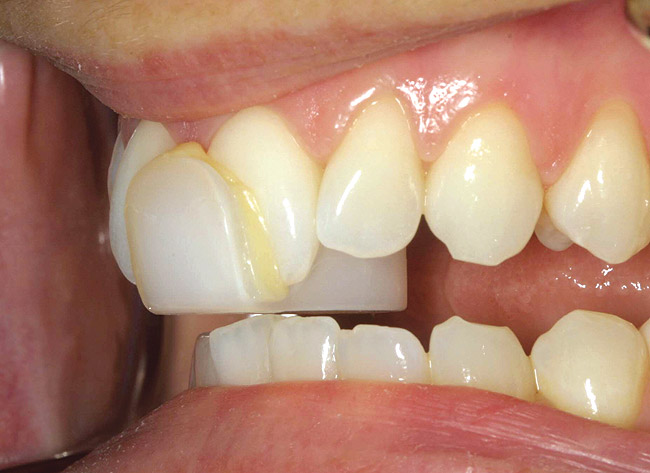 1. The occluding surface covers the central incisors only, with perpendicular contact of the opposing central incisors. The Lucia jig relined with warmed stick compound is a very efficient chair-side method.