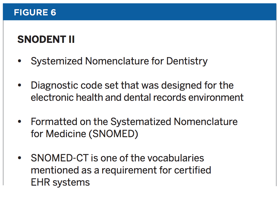 5. American Dental Association, Standards Committee on Dental Informatics. http://www.ada.org/en/member-center/member-benefits/practice-resources/dental-informatics/snodent. Accessed October 27, 2015.
