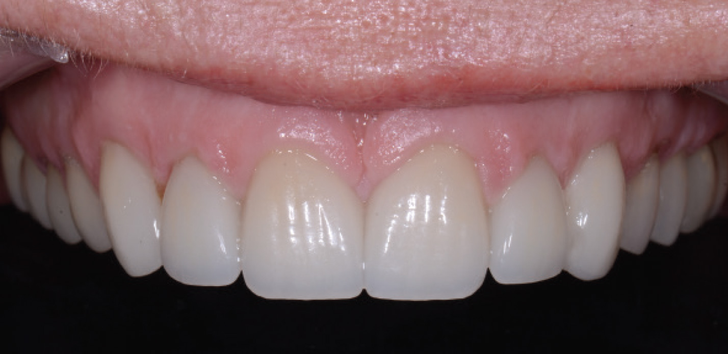 Self-adhesive resin cements can also be used for cementation of zirconia and lithium disilicate restorations. These materials are dual cure, allowing for easy cleaning following a brief light curing from the buccal and lingual, and continued dual curing where light penetration is inadequate (Figure 2). The materials typically transition from an acidic pH level to a neutral pH level during setting. It is the initial acidic pH level that is responsible for the self-etching properties. Self-adhesive resin cements are available in a range of colors, including translucent or neutral, to allow optimal esthetics (Figure 3). Bond strengths range from low (5 to 8 MPa) to medium (8 to 15 MPa).7 Self-adhesive resin cements cause reduced levels of tooth sensitivity and provide a good seal against microleakage.8 Light curing these materials increases their flexural strength. Packaged in syringes with self-mixing tips or capsules, these materials are efficient and easy to use.9