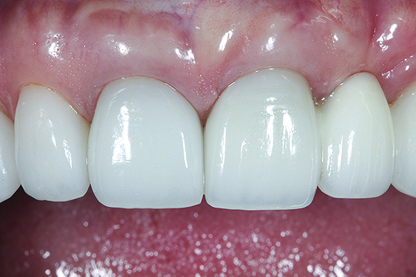 The master cast and abutment were returned to the laboratory for fabrication of the restoration (Figure 15). An all-ceramic crown (e.max®, Ivoclar Vivadent) was fabricated on the custom abutment; it matched the contours of the adjacent central incisor. After completion of custom shading, the definitive abutment and crown were returned to the restorative dentist. The abutment was tried in (Figure 16), and a radiograph was taken to confirm complete seating between the abutment/implant and the crown/abutment. The definitive abutment screw was torqued to 20 Ncm, and the screw-access opening was blocked out with Teflon tape.