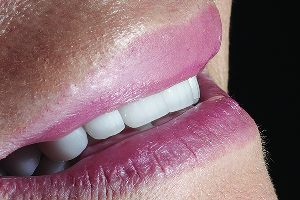 While all-ceramic tooth- and implant-supported restorations have become increasingly prevalent, the esthetic results of all-ceramic restorations cemented over metallic implant abutments may be questionable. Sailer et al recommended that when choosing abutments for anterior single-unit cases, several factors should be considered, including smile-line height, soft-tissue thickness, the color of the neighboring teeth, and the patient’s esthetic expectations.30 For esthetically demanding situations, customized ceramic abutments were recommended. For patients with thin peri-implant soft tissues, a combination of zirconia abutments and all-ceramic crowns were recommended. In cases with thick mucosa, titanium abutments could be used, when combined with metal-ceramic crowns. To avoid difficulties with retained cement, Sailer et al also recommended the use of screw-retained restorations whenever screw-access openings could be positioned palatal to the incisal edges of the implant restorations.