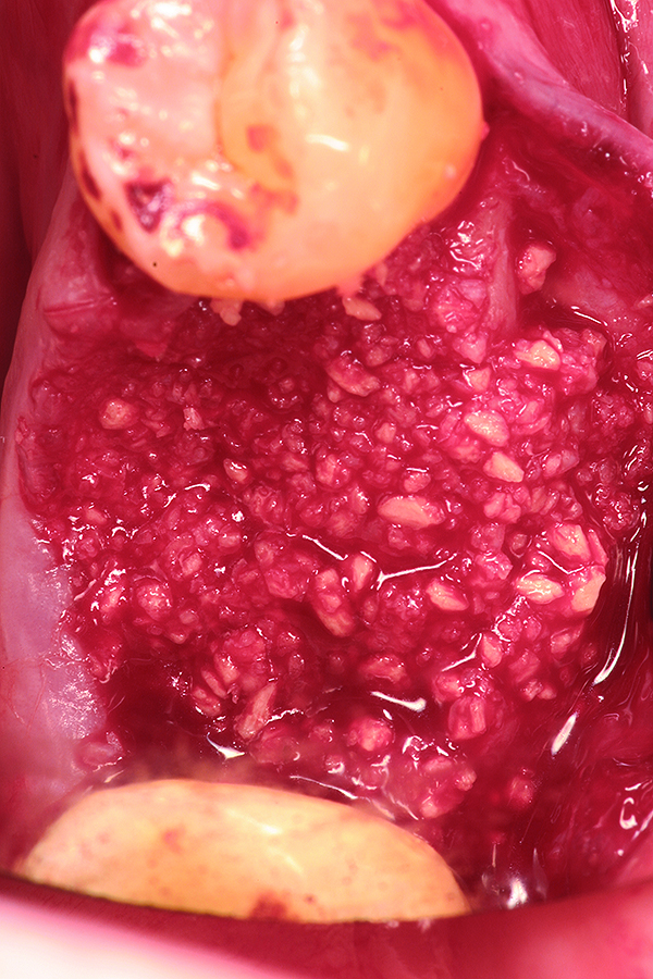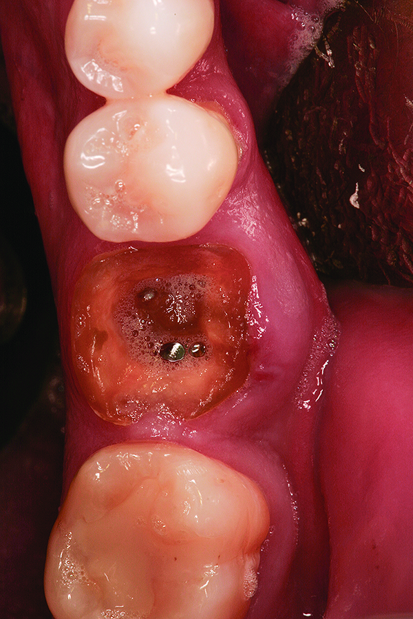 Ten consecutive patients who had sought treatment at a private practice limited to periodontics and dental implants in Austin, Texas, were identified. All patients had required extraction of a tooth with site preservation to facilitate future placement of dental implants. Written and signed informed consent was obtained prior to treatment for all patients. Local anesthesia was obtained using 4% articaine hydrochloride with 1:100,000 epinephrine (Septodont, www.septodontusa.com). In all cases, a full-thickness mucoperiosteal flap was reflected, and tooth removal was accomplished atraumatically. Multi-rooted teeth were sectioned with a high-speed handpiece, while single-rooted teeth were removed with periotome assistance.