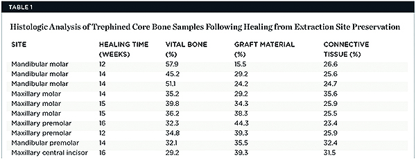 After roughly 3 months (14.2 weeks), bone formation in all cases was adequate in both buccolingual and apicocoronal dimensions to enable proper locational placement of the planned dental implants without the need for any additional bone-graft material. Figure 1 through Figure 19 depict three of the cases. Analysis of the trephine core samples (Table 1) revealed results consistent with findings of previously published site-preservation studies.