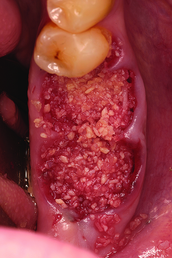 Multiple studies have evaluated the bone-forming effectiveness of both mineralized and demineralized bone allografts when used for dental surgery.18-24 Different mechanisms are at work in the two types of graft materials.25 Demineralized bone allograft, for example, provides a source of osteoinductive factors.26 It contains type I collagen and various proteins such as bone morphogenetic protein (BMP) with the capacity to influence cell behavior, including proliferation and attachment.27 Shigeyama and colleagues tested commercially prepared demineralized bone allograft via multiple assays and Western Blot analysis, with results showing the allograft retained proteins such as BMPs 2, 4, and 7.27 By reducing the calcium content of allograft particles via demineralization, it is thought that faster release of residual proteins such as BMPs may be attained for improved bone healing. Multiple studies have documented higher osteogenic capacity in vitro for demineralized bone allograft compared to mineralized bone allograft.18,19 Accordingly, one recent study that compared demineralized to mineralized bone allograft used in extraction socket site preservation found significantly greater new bone formation from the use of the demineralized material.28 In this study, however, it is interesting to note that no significant differences in alveolar ridge dimensional changes were noted between the two allograft groups and that only sockets with minimal dehiscence defects were included in the study. The latter statement highlights one of the problems that many clinicians find with demineralized bone allograft. Because the product is demineralized, its structural integrity is minimized. While this is beneficial for the rapid release of BMPs, it may pose a problem in osseous defects that are not well contained, such as extraction sockets with significant dehiscences or absent bony walls. The issues associated with allograft structural integrity are minimized with mineralized products. Because they retain their calcium content, mineralized cortical allografts are considered osteoconductive materials29 and are better suited for defects with less than optimal containment, especially when compared with demineralized allografts.30