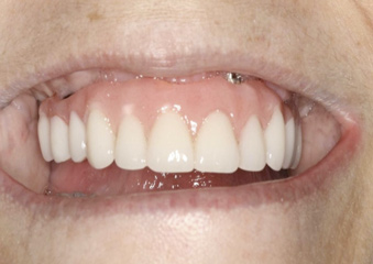 This is an unfortunate mindset in that current advances in protocol and technology can result in significant advantages in addressing some or most of these concerns. The patient shown in Figure 12 may serve to illustrate this point. She had a destroyed maxillary dentition, a less-compromised but highly unesthetic mandibular component, and a single goal: to be able to "smile at my grandchildren again." In consultation with her and her family, it was decided that a double-arch fixed implant approach would most realistically address her esthetic goals and provide her with the desired prosthetic result. She was 102 years old at the time of initial consultation. Using a staged operating-room approach, provisional restorations were initially delivered, followed by subsequent definitive hybrid final restorations. She was able to use these comfortably for the next 6-½ years (Figure 13 and Figure 14).