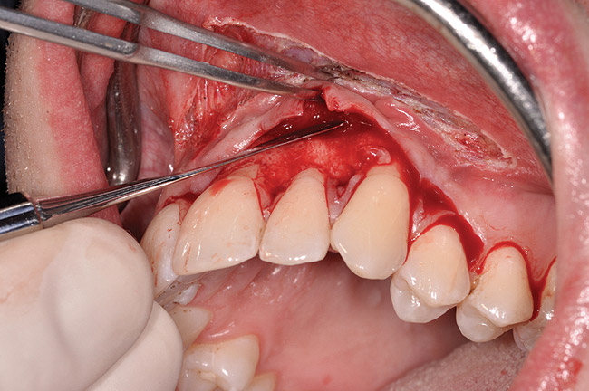 The authors have introduced a laser-assisted vestibuloplasty approach (LAVA) procedure that is designed to prevent recurrent recession after surgical correction, which has been reported in the literature.29,38 This first involves a flap procedure for insertion of the dermal matrix graft material to be used to achieve root coverage and increase zones of existing attached keratinized tissues. To complete the vestibuloplasty procedure, the surgeon separates the mucosal tissues apical to the preexisting mucogingival junction in the area of the teeth exhibiting gingival recession. The authors advocate using a Nd:Yag laser with a power setting at 5 watts to accomplish the vestibuloplasty and release any excessive muscle attachments or frenal pulls in the affected areas (Figure 3).