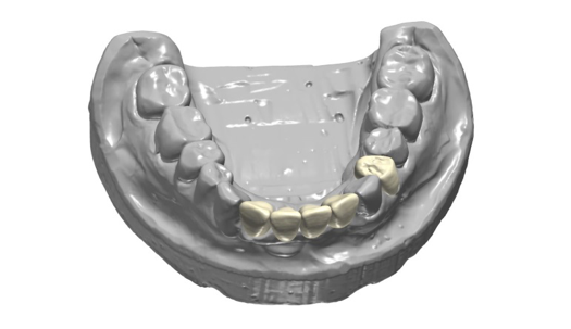 After completing an initial diagnostic appointment, a patient accepted three single-unit full-contour zirconia crowns that were milled from the digital impression and cut back for porcelain application. The application by a technician is analog dentistry. The ability of a dental laboratory to scan an analog crown-and-bridge impression is called converting an analog impression to a digital impression. The workflow after the conversion has become digitized. A dental model is virtually created with computer software, and a full crown proposal is fabricated for inspection virtually before the crown is milled (Figure 2). Due to the color of the digitized impression, the margins of the crown preparations are more easily and rapidly identified. The laboratory will also 3D print a working model, which will be used to develop the morphology of the final restoration by hand placement of porcelain (Figure 3). The decision to prescribe a full contour zirconia crown with cutback for porcelain application or complete full contour zirconia crowns lies solely on the attending dentist.9 A discussion with the patient before preparation of the teeth is imperative. After the discussion, the patient requested the zirconia copings with cutback and porcelain application for the posterior crowns (Figure 4 and Figure 5).