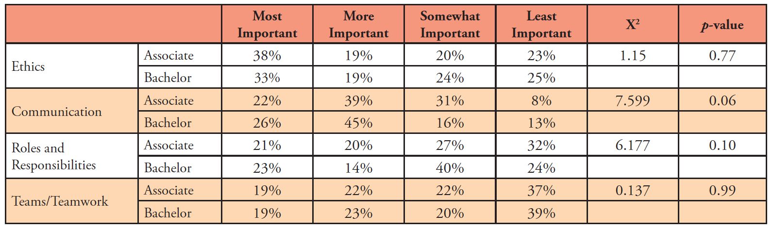 Faculty participants were asked to rank the IPE competencies of ethics, communication, roles and responsibilities, and teams and teamwork, from most to least important. Ethics was most frequently ranked as the most important competency (37%, n=139), followed by communication (23%, n=88) and roles and responsibility (21%, n=79). Overall, teams and teamwork ranked lowest (19%, n=73). Student competencies were ranked and grouped according to degree offered and program setting; however, differences in competency frequencies were not found to be statistically significant (Table IIIa and Table IIIb).