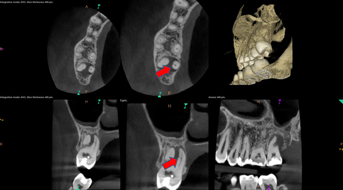 Thorough endodontic diagnosis involves the patient's chief complaint, medical and dental history, and clinical and radiographic examination.5 Accurate data lead to better treatment decisions and potentially more predictable outcomes.6 In May 2015, an updated joint position statement of the American Association of Endodontists and the American Academy of Oral and Maxillofacial Radiology was published. Based on recommendation 2 of the CBCT Position Statement, limited fields of view (FOV) CBCT should be considered the imaging modality of choice for diagnosis in patients who present with contradictory or nonspecific clinical signs and symptoms associated with untreated or previously endodontically treated teeth.7Limited FOV is the most ideal for use in endodontic applications because it is capable of providing sufficient images at a low radiation dose.5 CBCT imaging has the capability of detecting periapical pathology before it is apparent through radiography.8 Findings of clinical studies showed that periapical radiolucency was detected in 20% of cases using radiographs, compared with 48% using CBCT.9