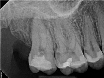 The second case study is that of a healthy 88-year-old woman who presented with significant bone loss on the mesial and apical aspect of tooth No. 18, which would suggest potentially a vertical fracture in the tooth (Figure 9 and Figure 10). The clinician had initially recommended extraction, which they informed the patient would likely be the best course of action, especially given that she had plenty of bone anterior to the tooth to place implants. When the recommendation of extraction was made to the referring dentist, he had some resistance because both he and the patient were interested in saving the tooth. Although the clinician initially stood firm on the recommendation, he received a call from the general dentist about a month later. He further expressed their desire to save the tooth, and he asked if the endodontist thought the new technology, the GentleWave Procedure, could be a solution. The informed consent was obtained and the patient was scheduled for treatment. Because the canal was quite calcified apically, a defined working length could not be determined. Obturation was performed using warm vertical condensation of gutta-percha.