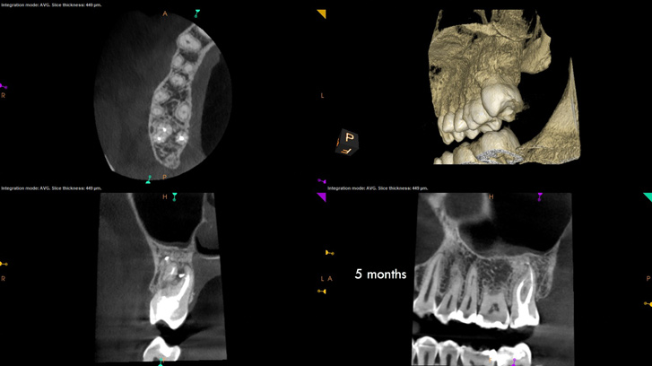 Figure 6 through Figure 8 demonstrate that, 5 months after the procedure, complete healing had occurred, notably on the distal, where the probing had resolved to 2 mm. The patient then had a crown placed by her general dentist. Given her positive experience with the technology, she was eager to return as needed for continued follow-up.