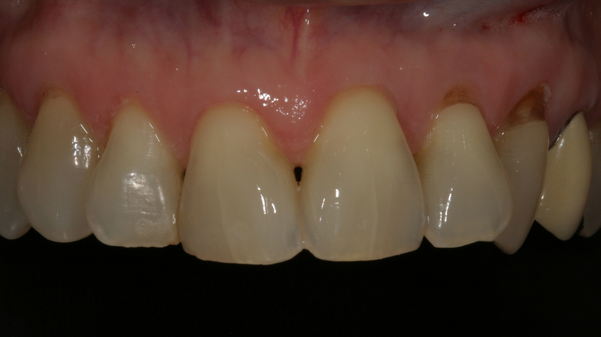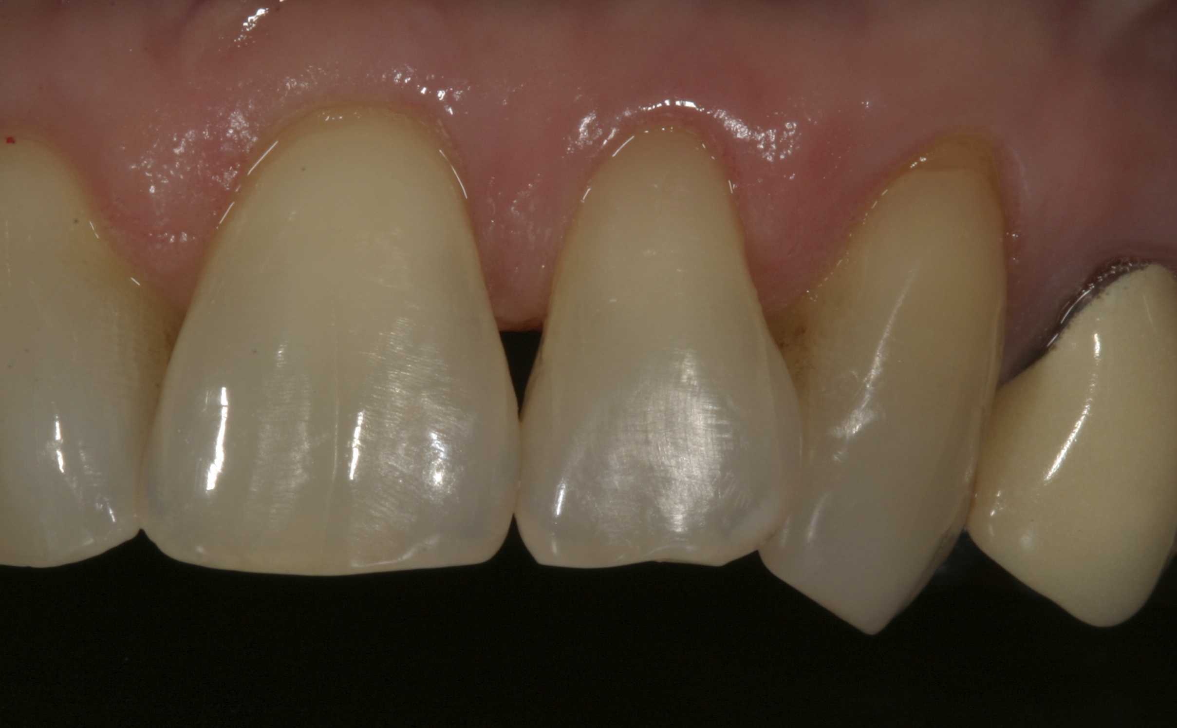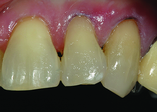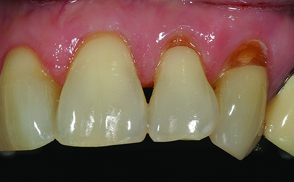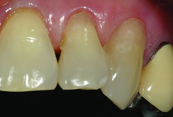 A 55-year-old woman presented with root decay along the left lateral incisor (tooth No. 10) and canine (tooth No. 11) (Figure 1). It was proposed that invisible Class V restorations be placed using an MMID procedure. There are several keys to attaining a successful invisible Class V restoration. Proper understanding of composite resin shade selection, preparation design, and sequence of composite resin layering are important to achieve an ideal blending of the composite resin to the existing tooth. Correct finishing and polishing technique is equally essential in obtaining a seamless esthetic restoration.3,11