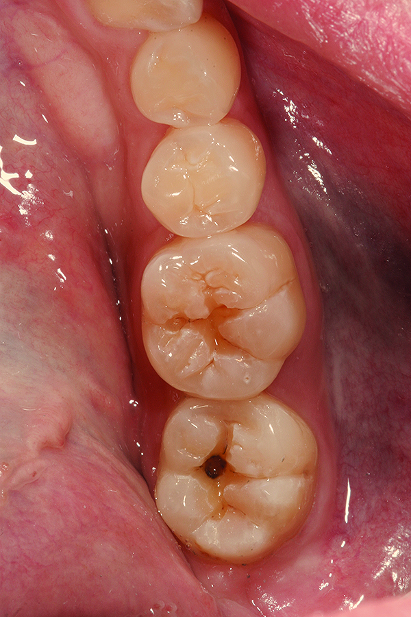 A 48-year-old patient presented with an old, failing Class I alloy restoration and showed recurrent decay on the lower molars (Figure 9). After the existing alloy was removed, the remaining tooth structure was evaluated. It was determined that despite the significant extent of caries present, it would be possible to perform a minimally invasive procedure using an injectable composite resin and an RMGI (Figure 10).