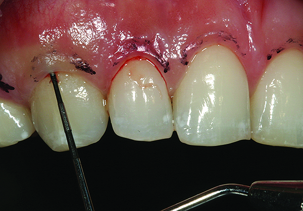 First, a full periodontal assessment was performed to determine gingival sulcus depth, position of biologic width, osseous crestal location, and periodontal biotype (Figure 19).27,28 Excess gingival tissue was then removed along the facial surface of teeth No. 3 to No. 14 with a diode laser (Figure 20). Because this was a combination-treatment case, laser-assisted gingival sculpting was the preferred treatment of choice. The diode laser cauterized the wound site, making same-day porcelain veneer preparations possible. To reestablish the biologic width apically, microsurgical diamond burs were used to reduce the vertical and horizontal crestal bone.29-33 Using this technique of flapless gingival surgery allows the patient’s healing time and pain to be minimal.