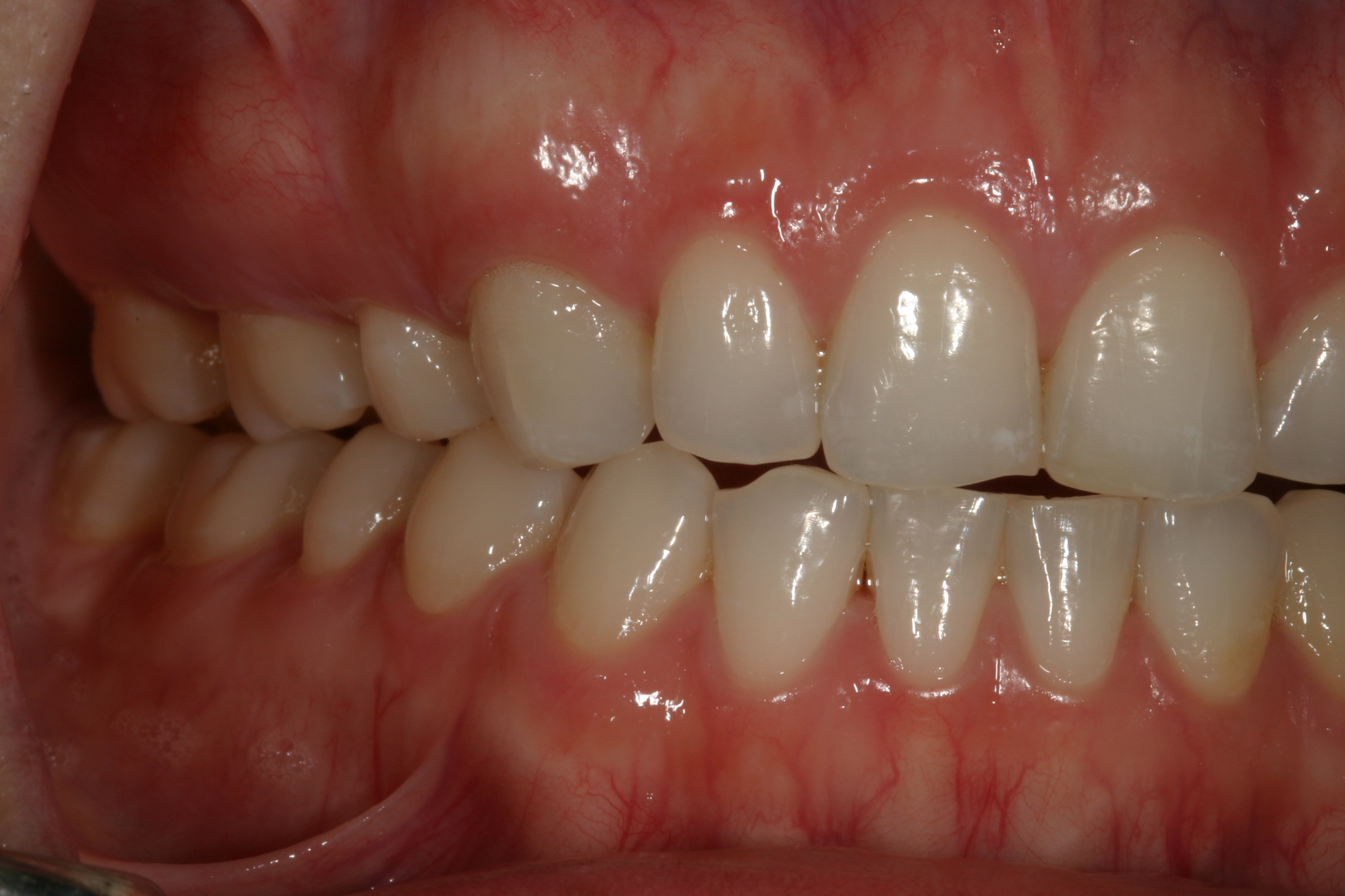 A healthy 24-year-old woman presented to the office with a desire to modify a high, gummy smile and small teeth (Figure 12). Over the course of many years, she had undergone extensive orthodontic treatment, including the removal of four bicuspids. The orthodontic outcome left her arches extremely narrow and her smile line angled severely inward (Figure 13). Clinically, her occlusion was in bilateral group function (Figure 14 and Figure 15). Many dentists with whom she had consulted advised that her only option was to undergo Le Fort I osteotomy to reduce the gumminess of her smile and lessen her vertical maxillary overgrowth (Figure 16). Although this traditional approach may have resolved the issue of her gummy smile, it addressed neither her small teeth as they related to her smile nor her malocclusion. In an effort to provide the patient with a more comprehensive solution, a minimally invasive comprehensive dentistry treatment plan was devised and presented to her. This modern approach would conservatively and effectively address all of the patient’s concerns.