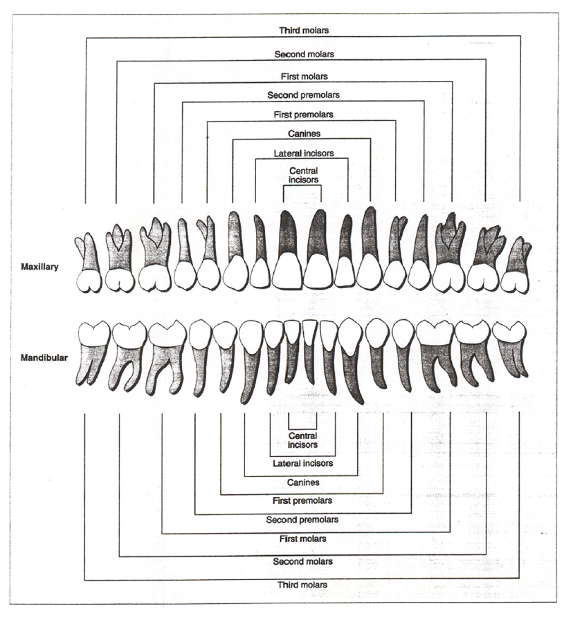 Permanent dentition usually consists of 32 teeth, eight teeth in each quadrant. Eruption patterns vary from child to child (Figure 6 and Figure 7).