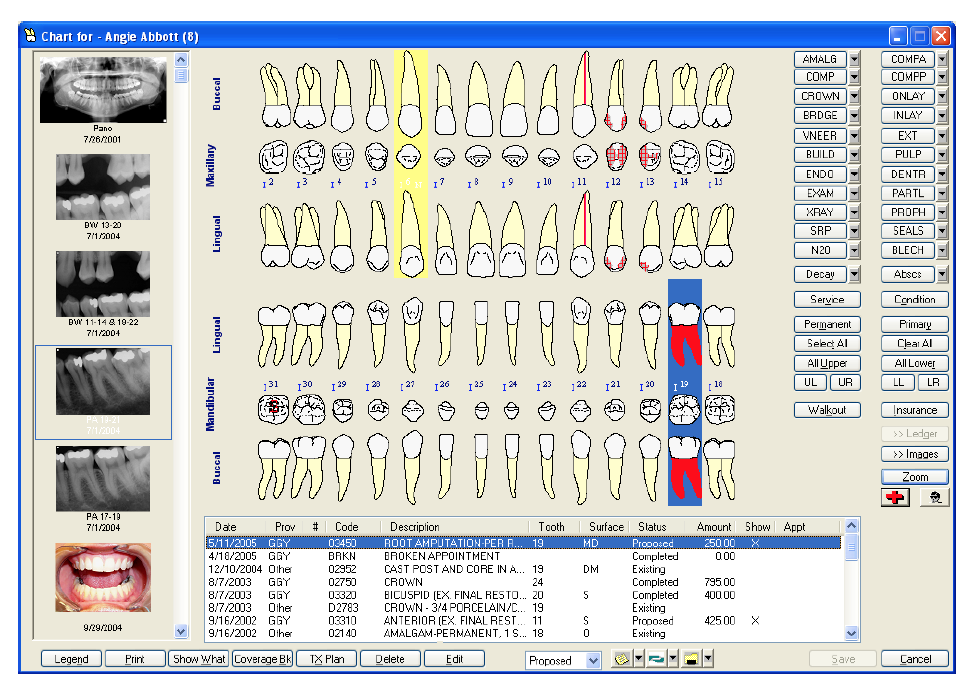 Using computer software specifically designed for charting clinical conditions in the treatment area is called computerized clinical charting (Figure 18). Particular codes are used to distinguish between different types of restorations and oral conditions that exist in the patient’s mouth. The administrative team member may not perform this task routinely in the treatment area, but it is beneficial to learn all of the codes to be able to communicate conditions to the patient and reasons to schedule future appointments.
