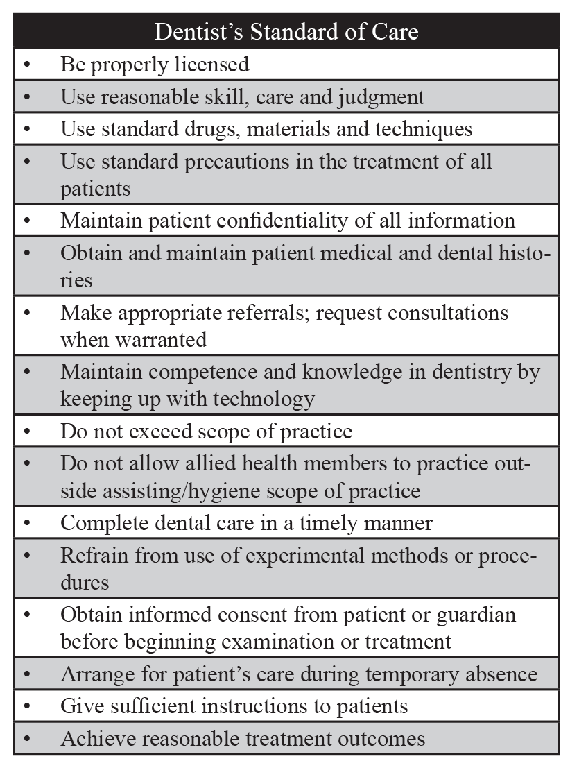 Standard of care is generally misinterpreted within the dental profession. Many believe that it is a state law or set of regulations listing specific steps a dentist must follow. It is not a state law or regulation, but a legal concept that provides common limits that a dentist must comply with in a given situation. The standard of care that a dentist must meet is the basic practices of highly regarded dentists who have comparable education and knowledge, who practice in similar disciplines and those who practice in a comparable area. When a dentist fails to meet the standard of care and the patient is wronged due to negligence, the dentist may be held liable for malpractice.