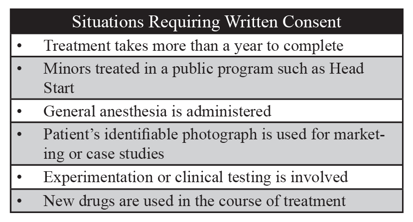 • Before beginning any treatment, a signed informed consent form should be obtained from the patient. Informed refusal forms should be obtained when a patient refuses a recommended treatment plan (for example, for radiographs, a dental examination or scaling and root planing) and should be documented on the patient record.