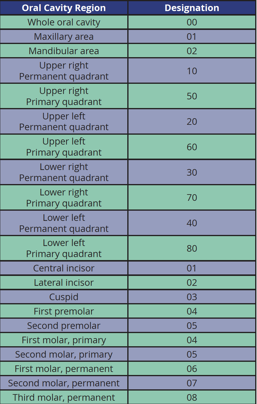 Quadrants with permanent dentition are given a number beginning with the upper right—1, upper left—2, lower left—3 and lower right—4. In the primary dentition, the numbers 5-8 are used for the corresponding quadrants. Each permanent quadrant is numbered 1–8 starting with the central incisor and ending with the molars. The primary teeth are numbered 1–5 in a similar method. In using the FDI system, the quadrant number is recorded first followed by the tooth number. For example, the mandibular right first molar in the permanent dentition is noted as 46 and in the primary dentition as 84. When verbally reading the two-digit notation, each number is read separately; 23 would be read as “two, three” (Figure 15).