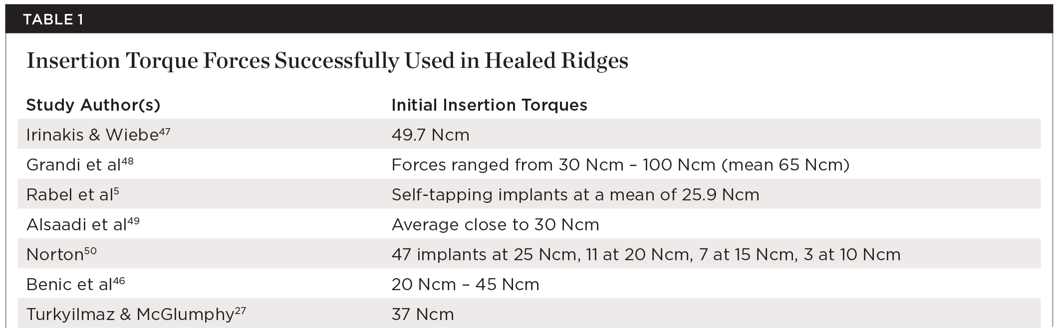 The insertion torque used to place implants into healed ridges varies depending on the quality of the bone, implant shape, implant surface, and method of osteotomy preparation.7-15 Relevantly, a recent systematic review by Benic et al46 found that the usual insertion torque clinicians use varies between 20 Ncm to 45 Ncm. Different initial torque forces used successfully in healed ridges are listed in Table 1.5,27,46-50 In summary, a precise torque force that should be routinely used to insert an implant into a healed ridge has never been defined. Nevertheless, the literature indicates that clinicians successfully use insertion torques of ≥30 Ncm.5,27,46-49 This, however, may vary among individuals and sites within the same mouth.