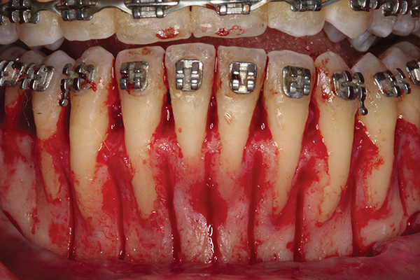 Jeopardizing the surrounding periodontium: The use of CAO has been thought to jeopardize the overall periodontal condition because of flap opening and cortical bone reduction.60 So far, the literature has reported no adverse effect on CAO use toward the surrounding periodontium.43,61 Furthermore, it has been shown that CAO actually reduced the mean pocket depth by about 0.2 mm to 1.5 mm when compared to sites that did not receive treatment with CAO.35 In addition, some have reported that CAO use increases the dentoalveolar bone width10,62 and the zone of keratinized tissue height.63