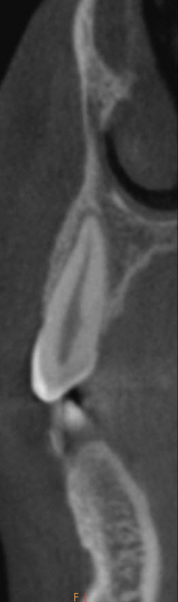 Based on Frost’s work14 with bone healing and his descriptions of the regional acceleratory phenomenon (RAP) during fracture healing, the Wilckos proposed several critical concepts explaining the mechanism by which teeth move faster after corticotomy.10 They found that the alveolar bone following a corticotomy loses structural integrity as a result of a transient demineralization.15 They described the healing as a soft collagenous bone matrix that remained within the dentoalveolar segment and facilitated the orthodontic transportation of the teeth. In addition, this matrix was the source of remineralization when the tooth was retained in its final position. Thus, the healing pattern for accelerated tooth movement caused by the corticotomy and dentoalveolar decortication surgical insult is coupled with the demineralization–remineralization process. This has been well confirmed in a rat model.16 This phenomenon of a “bone matrix transportation” was described because the teeth do not actually move through the dentoalveolar bone segment as with conventional pressure-tension orthodontia, but instead they move with the dentoalveolar bone segment that is being displaced in total during its demineralized state.17 Figure 12 demonstrates particulate bone grafting after corticotomy and dentoalveolar decortication as a part of the SFOT approach. Figure 13 and Figure 14 show cross-sectional cone-beam computed tomography images of tooth No. 6 before and after SFOT. When seen together, the images demonstrate improved incisor angle position and axial inclination of the cuspid as well as a significantly improved dentoalveolar bone volume post-treatment.