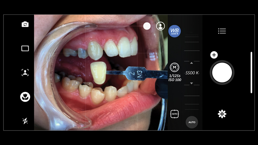 For most dental clinicians and technicians, the acquisition of professional-level photographs with a DSLR camera requires a steep economic investment and possesses a shallow learning curve. The time commitment and nebulous return on investment are certainly potent deterrents to the incorporation of these systems into daily practice. While remaining cognizant of the need for photographic documentation, the dental field has witnessed an increase at the low end of the dental photography continuum through the use of the ubiquitous smartphone as a proxy for the larger and more expensive DSLR camera setups. Most smartphones will allow the user to customize and control the elements of the exposure triangle via the internal camera settings or by means of a third-party application (Figure 4); however, the diminutive nature of the lenses, apertures, and sensors of these devices makes the necessary attainment of light problematic. When this is coupled with low-capacity native light output on the subject being photographed, the resulting images are often distorted, low-resolution, and possess inconsistent reproduction of color and detail, which renders them unacceptable for documenting patient treatment and collaborating with the laboratory (Figure 5 and Figure 6).