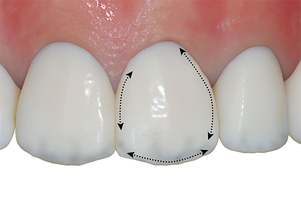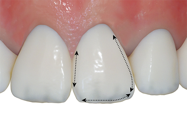 Transitional angles-Incisor shape is related to the anatomy of the interproximal ridges, which are also called transitional line edges.13 These lines are slightly curved and vertically oriented, and represent the intersection of the facial surface and the reflective surface emerging from interproximal contact.14 Line angles can be placed strategically to change how light reflects off the tooth. The teeth will appear longer if the mesiofacial and distofacial line angles are moved toward the center of the tooth. If the line angles are placed with a wider trajectory, the tooth will be perceived as shorter and wider.