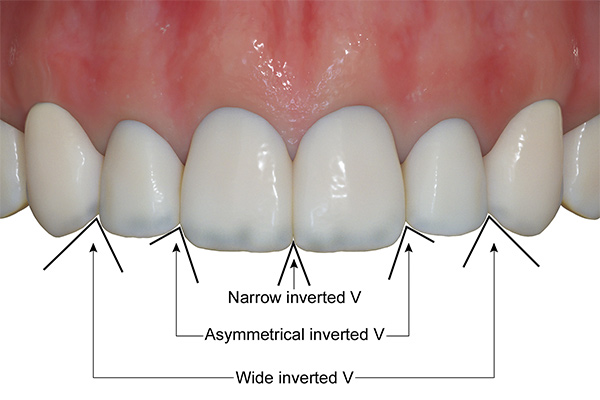Midline-The dental midline is an imaginary vertical line that runs from the nasion through the subnasal and interincisal points to the pogonion.5 Ideally, the papillae between the maxillary central incisors coincides with the midline of the face; however, research has shown that the maxillary midline coincides with the facial midline only 70% of the time, and slight deviations in the dental midline do not necessarily compromise esthetics.6