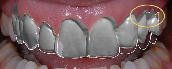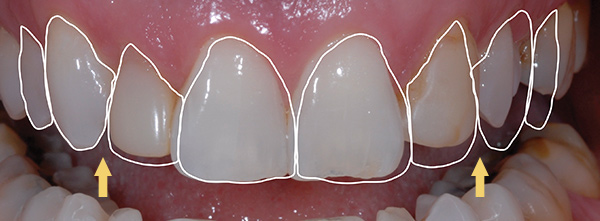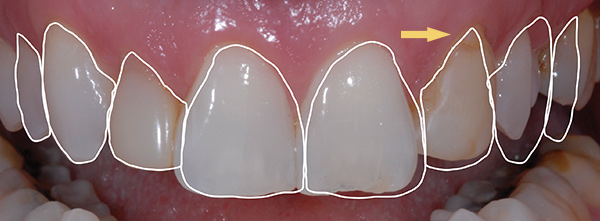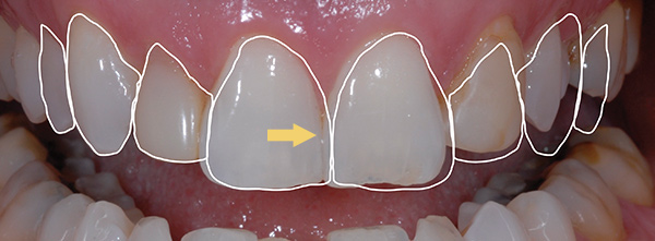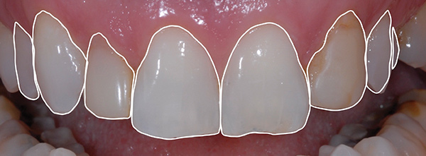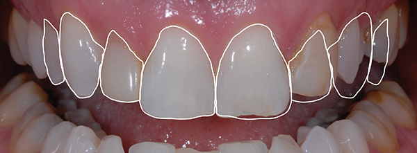 The first step in the smile design process is to take a full-face photograph with the patient looking straight into the camera lens with a full, natural smile. Landmarks on the photograph are then correlated with landmarks on the digital design, and the midline and canting are evaluated. Outlining the preoperative tooth forms using smile design software allows the ceramist and dentist to visualize any dissimilarities, or inconsistencies, from the patient's right to left (Figure 8). This step is critical for any case with a significant space and size discrepancy so the existing tooth forms and inconsistencies can be identified.