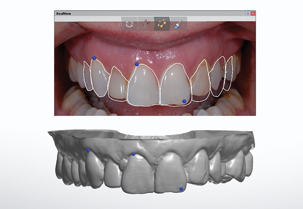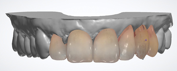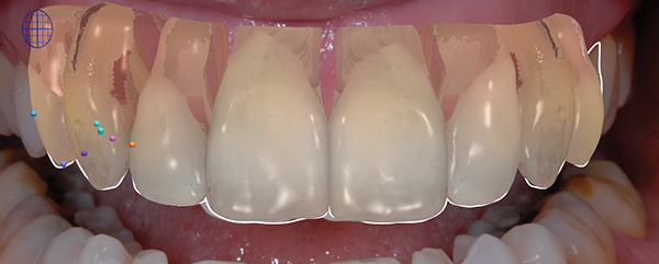 The digital design from the preoperative photograph was accurately aligned and synced with the 3D model using blue landmarks (Figure 13). The final result of the preoperative alignment appears in gray in the digital design proposal, with exposed natural tooth structure visible as white areas (Figure 14). Final outlines are mimicked in white from the patient's right to left as close to the 3D model as possible, with respect given to the emergence of the restorations from the existing free gingival margin of the clinical crowns. The clinician can then analyze the relationship of the design proposal and the original preoperative condition and determine if the digital design is feasible to implement and whether it will meet the stated goals.