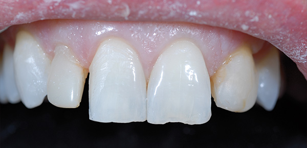 The gingival zeniths are positioned at the most apical points of the clinical crowns.16 When assessing gingival display it is important to use the patient's Duchenne smile, in which maximum lip dynamics occur as both the zygomatic major and orbicularis oculi muscles are engaged16; it is considered to be an authentic expression of happiness. In the patient's Duchenne smile in the present case, only the gingival zenith on the maxillary right lateral incisor was revealed, with the remaining teeth displaying a medium smile line, revealing the interproximal papillae but not the gingival zeniths. From a frontal perspective her smile was wide. On the right side, the distal of the maxillary right first molar was visible, but the left side presented with a dark buccal corridor. The center of her Cupid's bow was not coincident with the midline of her triangular-shaped central incisors. Her maxillary right canine had a round shape and was facially prominent and very attractive.