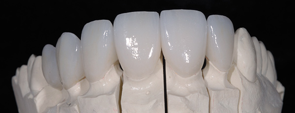 A HT BL2 lithium-disilicate ceramic ingot was chosen for strength and esthetics to obtain the final desired color to match the patient's existing dentition.18 The ceramist used distinct shade transitions and horizontal and vertical tertiary surface texture on the porcelain to create a symmetrical illusion from the patient's right to left (Figure 19).