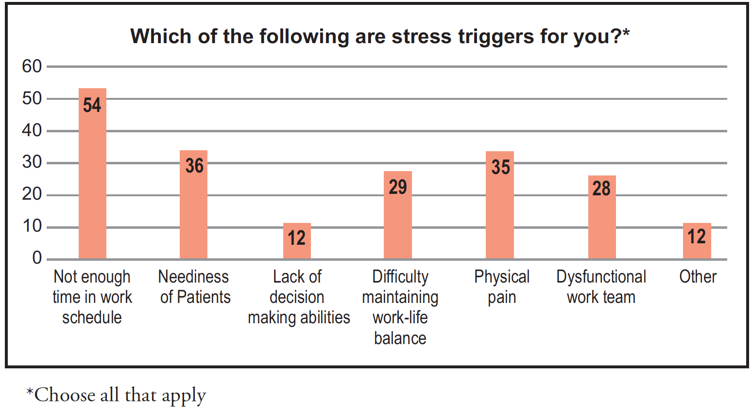 Thirty-eight percent of respondents (n=32) reported on their reason(s) for taking leave from work (Figure 1). Of these respondents, 11% percent (n=9) responded that their work leave was due to physical pain, while 12% (n=10) reported work leave was taken for unspecified specified reasons. None of the respondents indicated mental health as a reason for taking leave from work. When asked to select what most often triggered stress among those who responded, 35% (n=29) of the participants stated difficulty maintaining a work-life balance, while 34% (n=28) mentioned a dysfunctional work team as a stress trigger, and 65% (n=54) indicated not enough time in the work schedule as a stress trigger (Figure 2).