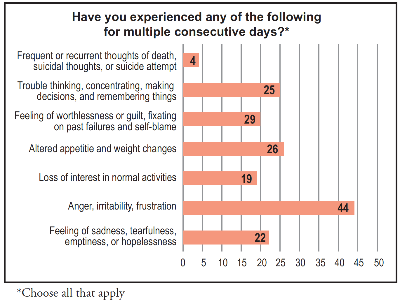 Respondents were asked to identify symptoms of depression and anxiety experienced over multiple consecutive days. These conditions were not labeled as symptoms of anxiety and depression on the survey. Data revealed the most common symptoms of depression were anger, irritability, and frustration (n=44), appetite and weight changes (n=26), and difficulty thinking, concentrating and making decisions (n=25) (Figure 3). Data identified symptoms of anxiety were trouble sleeping (n=45) and feeling nervous, restless, or tense (n=42). Nineteen percent of the respondents indicated that they had consulted a mental health professional about their mental health concerns (Figure 4).
