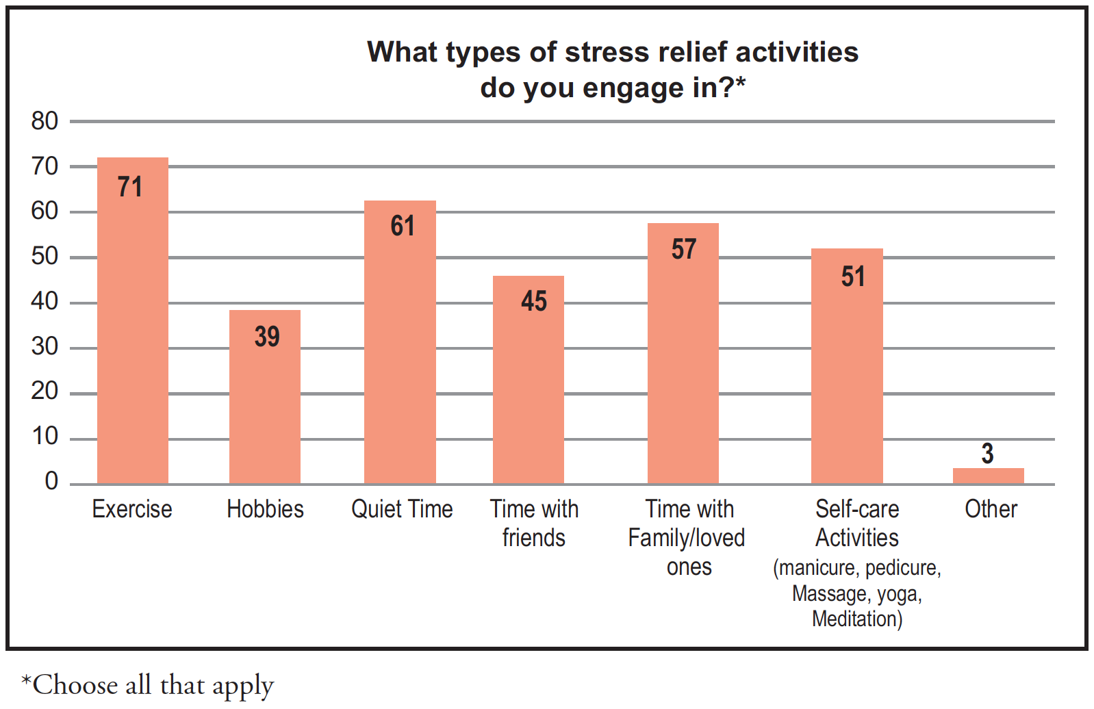 When prompted to identify all of the various types of stress relief activities the respondents engaged in, 85% (n=71) reported exercise, 73% (n=61) quiet time, 67% (n=57) spending time with loved ones, 62% (n=51) self-care activities, and 4% (n=3) other (Figure 6). Examples of self-care activities included manicure, pedicure, massage, meditation, and yoga. Respondents were asked how often they engaged in stress reduction activities, both on the average, and during times of significant stress. Rates of participation in stress-relief activities were shown to be lower during times of significant stress, with the majority 39% (n=33) stating 1-2 days per week, followed by 27% (n=22) who selected 3-4 days per week. In regard to the average frequency of stress-relief activities, 26% (n=21) selected 1-2 days per week, 42% (n=34) selected 3-4 days per week, 21% (n=17) selected 5-6 days per week, and 11% (n=9) selected daily.