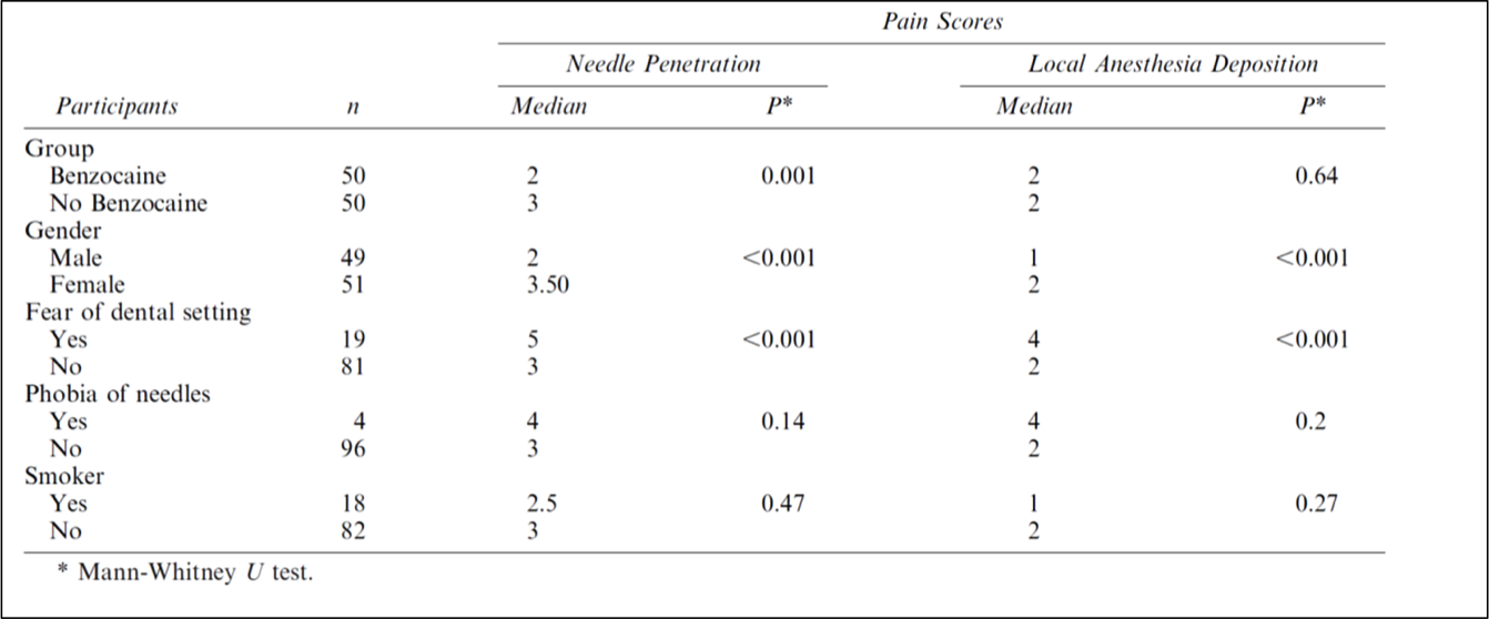The authors broke reactions down by gender; fear of dental settings; phobia of needles; and smoking habits. They found a small but significant pain reduction using benzocaine vs. no benzocaine; a significant difference in males vs females, with women experiencing more pain; more pain among those fearing the dental setting and those with phobia of needles vs without; and more pain among non-smokers (Figure 1).