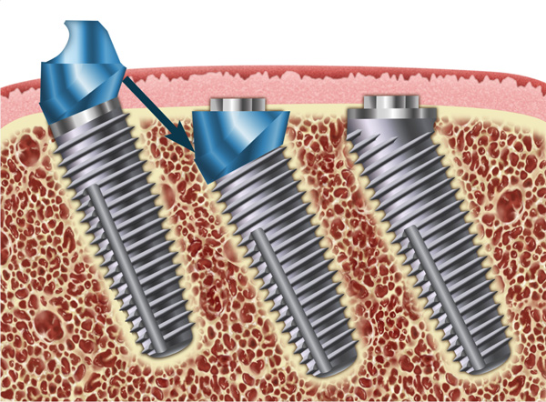 For surgical placement the dual-axis root form fixture is connected to an angle-correcting mount having a reciprocal inclination with the angulated platform of the implant enabling the fixture to be inserted in a straight axis (Figure 5 and Figure 6). An orientation dimple shows the rotational position of the implant in the bone.