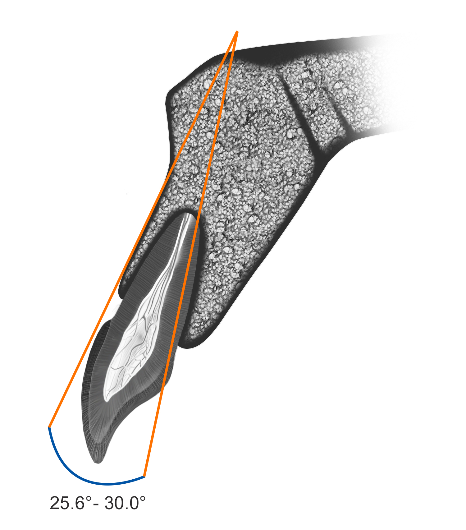 Howes et al40 described the research and development of an implant with 12-degree subcrestal angular correction, originally designed to overcome the anatomic constraints of the anterior maxilla for screw retention. In this unpublished study, the authors recognized the conflict between the surgical and restorative objectives in ISPs in the anterior maxilla. The morphology of the anterior maxilla was analyzed on lateral cephalometric radiographs of 30 class I to III maxillae. In addition, the differences between the axes of the crowns and roots of 30 anterior teeth were assessed, including canines and lateral and central incisors. The root–crown offset ranged from 8 to 12 degrees (Figure 3), and the angle between the buccal plate and ideal screw axis ranged from 25.6 to 30 degrees (Figure 4). The resultant fixture design had a 12-degree angular offset between implant body and prosthetic platform, with a 0.6-mm body thread pitch to minimize apical travel per rotation. This implant is able to accommodate these angulation constraints due to the combined taper and head angulation.