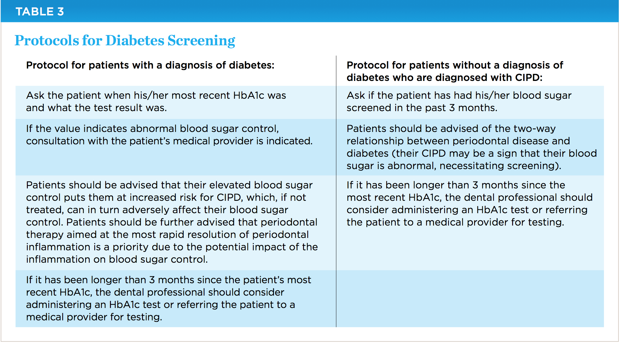 Thus, either in-office A1c testing or referral to a medical professional for blood sugar screening should be considered for dental patients who already have a diagnosis of diabetes, and for undiagnosed patients who present with signs and symptoms of CIPD (Table 3).